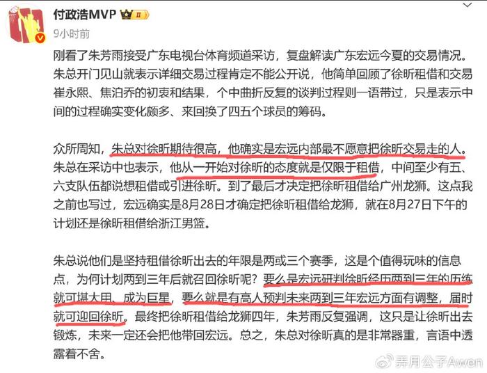 媒体人付政浩发文分析,朱芳雨在接受广东电视台体育频道采访时,开门见山就表示详细交易过程肯定不会公开说,但朱芳雨对于徐昕的期待很高,他确实是球队内部最不愿意把徐昕交易走的人。同时朱芳雨在采访时也明确表示,他从一开始对于徐昕的态度就是仅限于租借,中间至少有5、6支球队都想得到他。